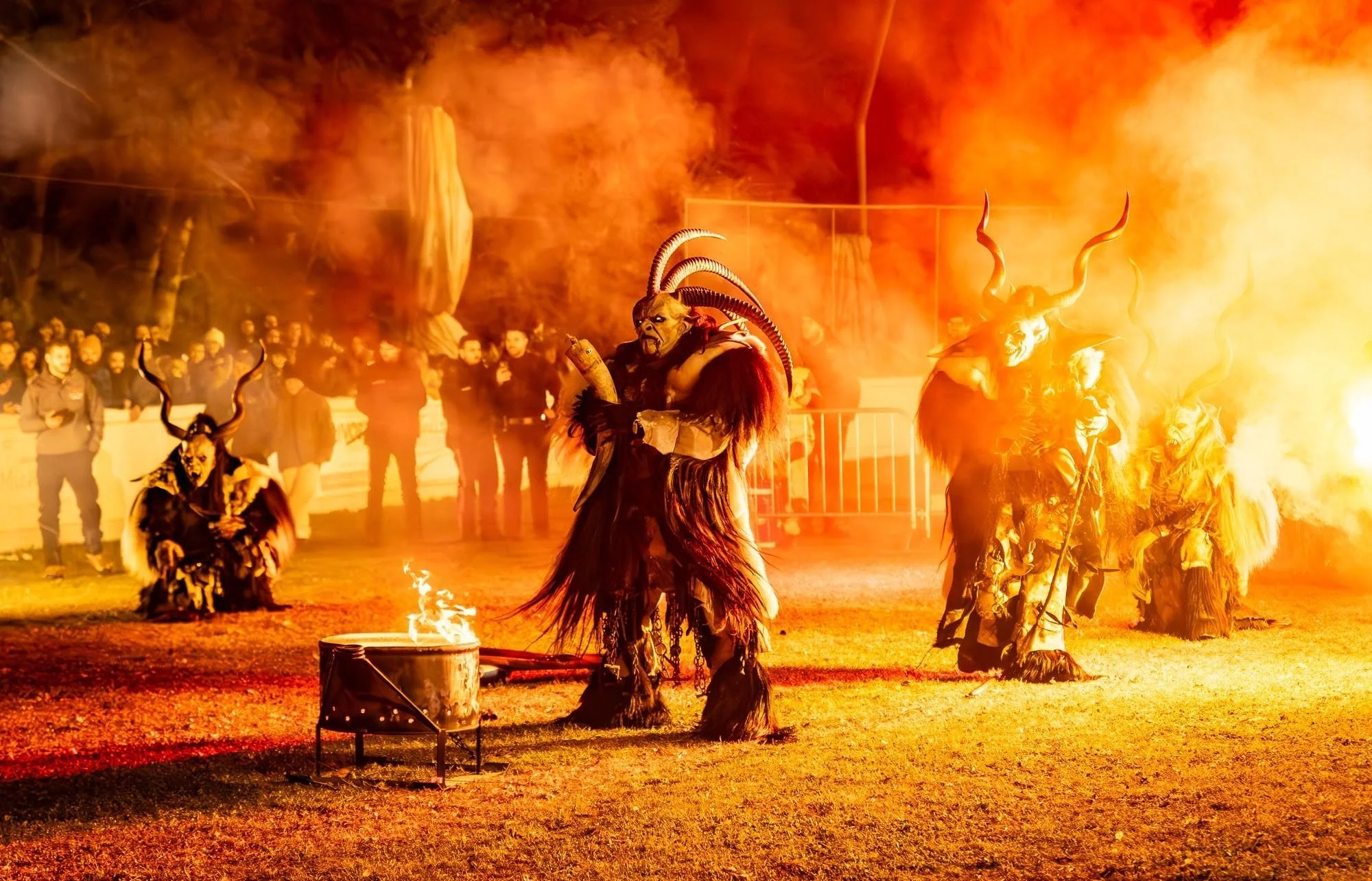 Ein Krampus-Schaulauf ist die spektakuläre, sichere und inszenierte Form des traditionellen Krampusbrauchs. Hinter stabilen Zäunen – ohne Schläge und ohne Gedränge – präsentieren Krampusgruppen aus Österreich, Südtirol und dem Trentino ihre beeindruckenden Shows mit Feuer, Licht und donnernden Glocken. Kunstvoll geschnitzte Masken, mächtige Fellgestalten und dramatische Effekte verwandeln den Platz in eine Bühne, auf der der alpine Mythos in einer epischen, aber kontrollierten Atmosphäre lebendig wird.